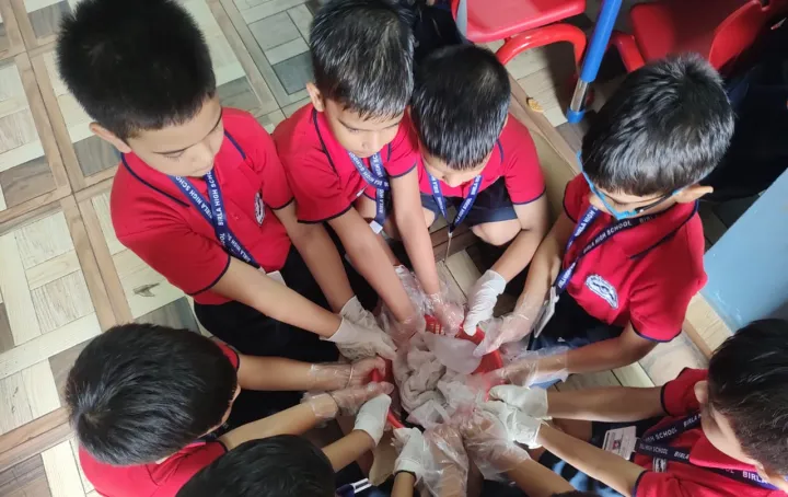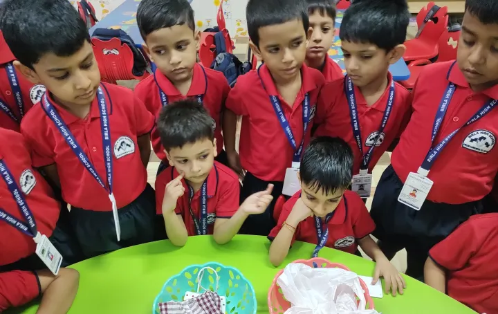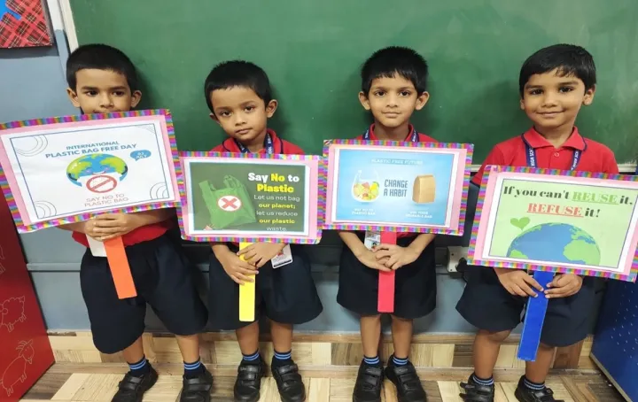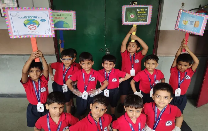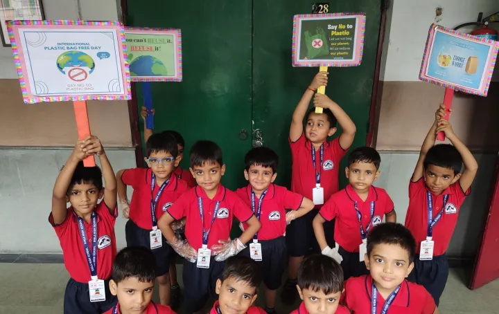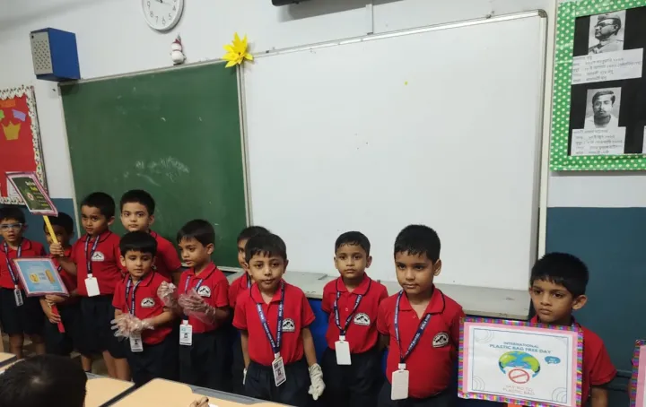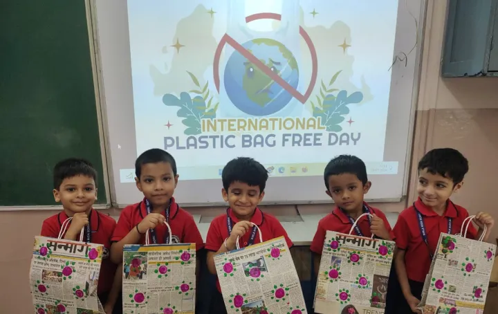 The boys of Upper Kindergarten enthusiastically celebrated International Plastic Bag Free Day by sorting waste, identifying recyclable items, and forming a 'Plastic Free Squad' to spread awareness. They crafted eco-friendly paper bags using old newspapers and decorated them with creative techniques like bottle cap and thumb printing. These activities not only taught the harmful effects of plastic but also nurtured teamwork, leadership, and eco-friendly habits among the children.